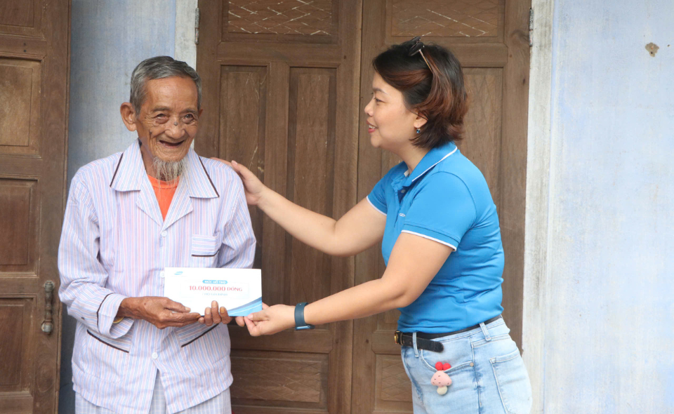 Cựu chiến binh Nguyễn Chương ở xã Hòa Thịnh là người cao tuổi, đi lại khó khăn được Tập đoàn Gemadept trao hỗ trợ tại nhà.